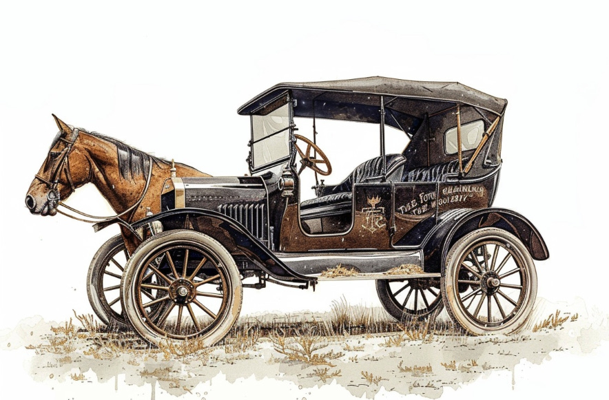 Image prompt for Midjoruney:: vintage advertisement style, Model T Ford centerpiece next to a horse, white background, 1900s graphic design elements, bold typography 'The Car for the Great Multitude', high detail on vehicle, muted color palette