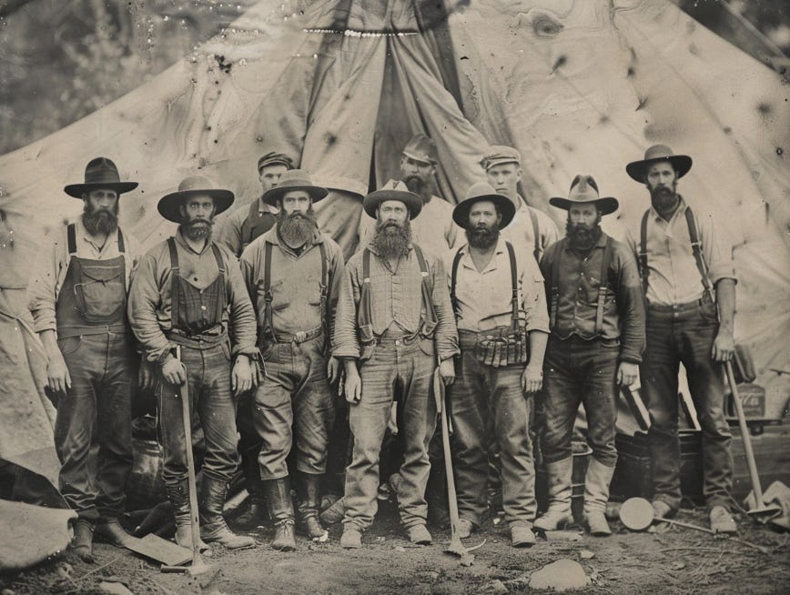 Image prompt for Midjoruney: vintage group portrait, gold rush prospectors from various backgrounds, lined up with their tools, authentic 19th century mining camp backdrop, high detail black and white, historical accuracy, 1860s wet plate collodion style